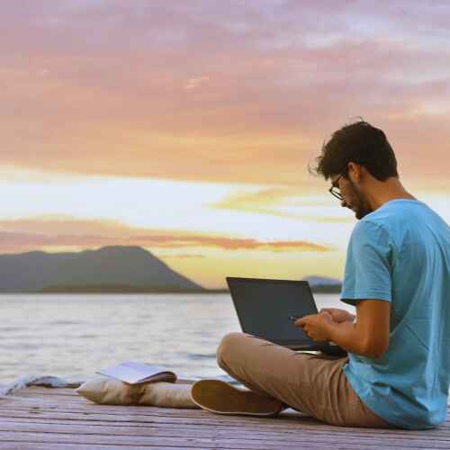 Man working remotely by the ocean during sunset – Spain Digital Nomad Guide concept